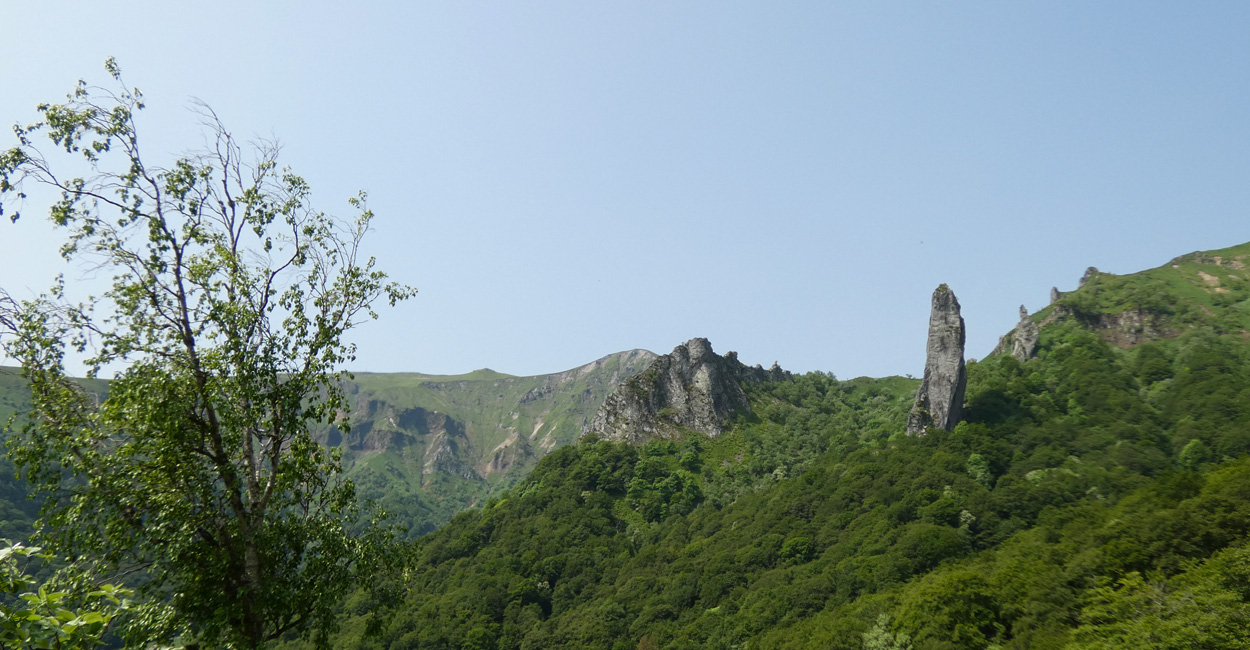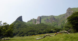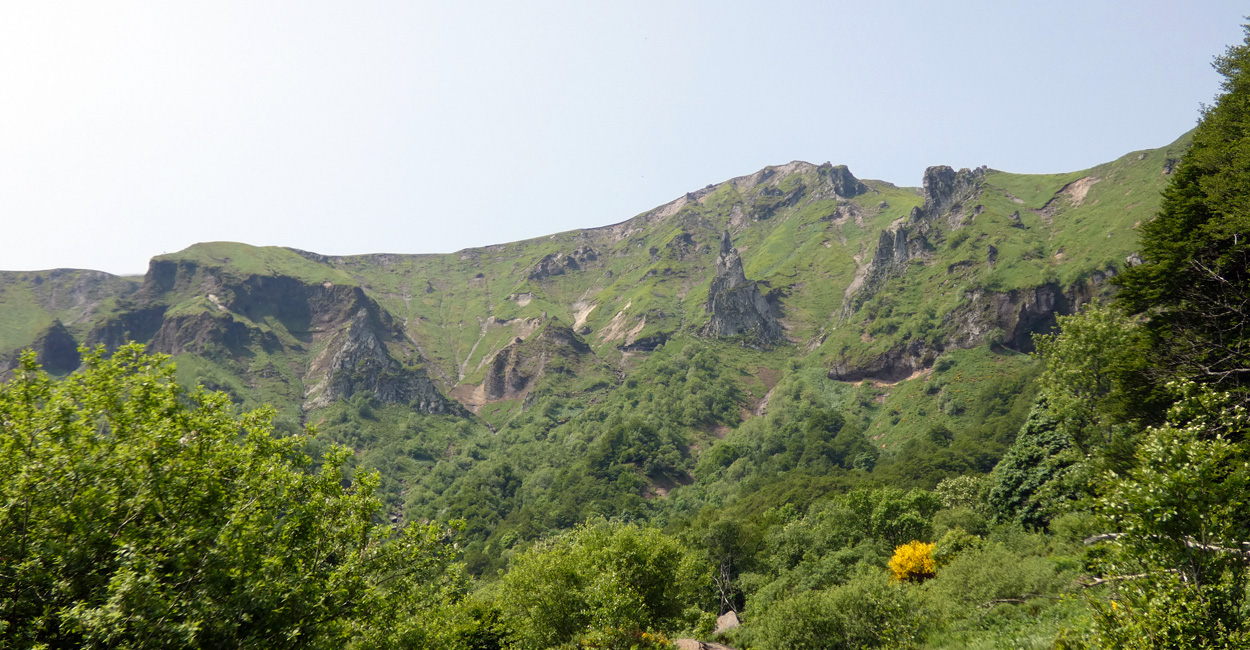 Au nord du Puy de Sancy, la Vallée de Chaudefour avec ses pentes rocheuses, dont La Dent de Rancune et la Crête du coq (2 dykes = anciennes failles volcaniques dans lesquelles s’infiltrait le magma) et sa cascade de La Biche (30 m de haut) avec ses orgues magmatiques.
