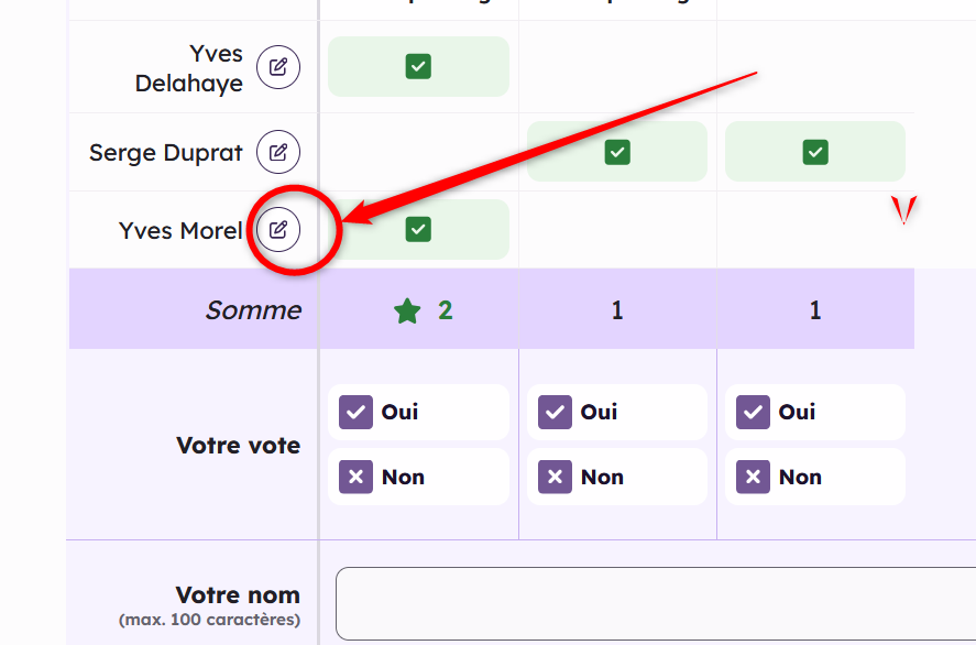 Amélioration du nouveau Framadate, vous pouvez modifier votre vote en cliquant sur le symbole indiqué ci-dessous : c’est plus facile sur un smartphone !