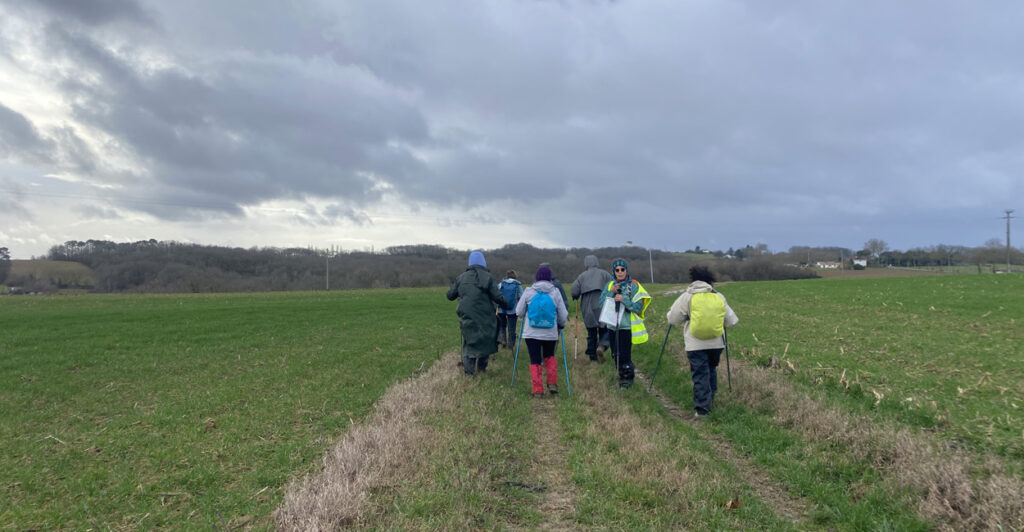 Malgré les prévisions météo annonçant de fortes pluies, nous étions 10 randonneurs aguerris au Rdv sous la halle de Seyches à espérer que la pluie cesserait pour pouvoir partir ! Motivés, nous nous sommes tous équipés pour affronter le déluge (bottes, guêtres, cape de pluie…) mais quelques minutes avant l’heure du départ, à notre (très) grande surprise, le ciel s’est soudain découvert. Profitant de cette accalmie inespérée, nous avons visité le village puis nous sommes joyeusement élancés sur les chemins. La météo a fait l’objet de nombreux échanges et des paris ont été lancés par les uns et les autres sur les possibilités de retour de la pluie… Malgré quelques panoramas un peu brumeux et certains passages inondés, nous avons largement profité de cette belle randonnée et des paysages du Lot-et-Garonne ! Au retour, notre persévérance a une nouvelle fois été récompensée par un bon petit gouté préparé par Marie, notre animatrice du jour.