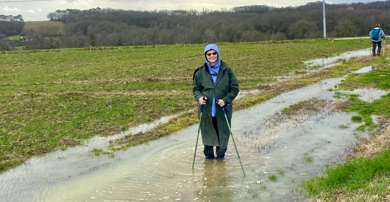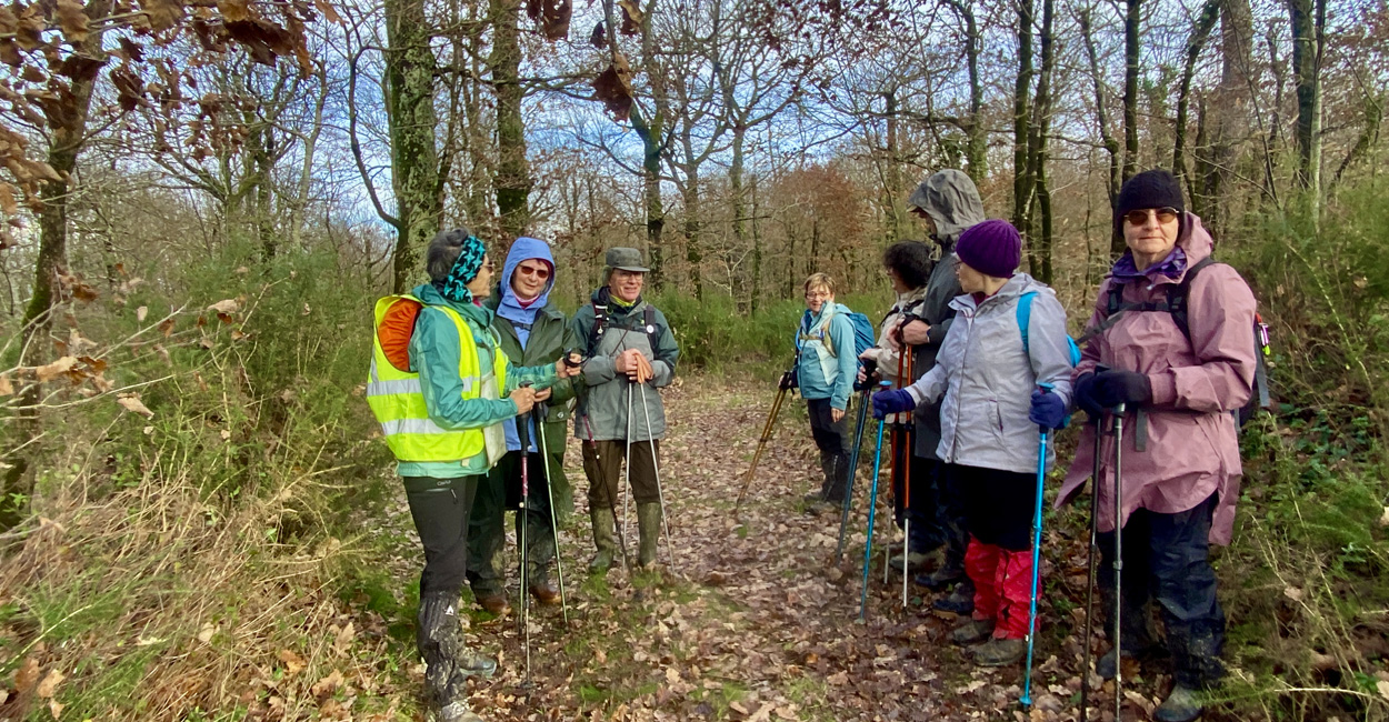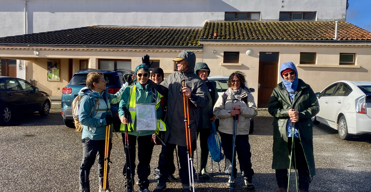 Malgré les prévisions météo annonçant de fortes pluies, nous étions 10 randonneurs aguerris au Rdv sous la halle de Seyches à espérer que la pluie cesserait pour pouvoir partir ! Motivés, nous nous sommes tous équipés pour affronter le déluge (bottes, guêtres, cape de pluie…) mais quelques minutes avant l’heure du départ, à notre (très) grande surprise, le ciel s’est soudain découvert. Profitant de cette accalmie inespérée, nous avons visité le village puis nous sommes joyeusement élancés sur les chemins. La météo a fait l’objet de nombreux échanges et des paris ont été lancés par les uns et les autres sur les possibilités de retour de la pluie… Malgré quelques panoramas un peu brumeux et certains passages inondés, nous avons largement profité de cette belle randonnée et des paysages du Lot-et-Garonne ! Au retour, notre persévérance a une nouvelle fois été récompensée par un bon petit gouté préparé par Marie, notre animatrice du jour.